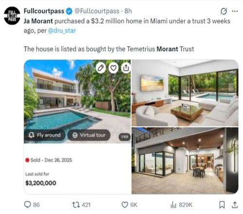 根据热火记者的消息,2025年12月份莫兰特就豪掷320万美元在迈阿密购置了一处豪宅。此消息一出立马就有灰熊与热火早已进行过交易谈判的言论,不过双方的讨论没有深入只是进行过试探性的对话。