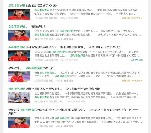 赛后的新闻媒体报道,几乎清一色把标题和头图聚焦在吴艳妮身上: