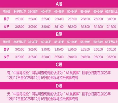 二是:成绩直通门槛上,选手在2023年12月17日至2025年12月16日期间的A1类赛事中,男子成绩需在2:30:00以内、女子在2:50:00以内,方可获得参赛资格。