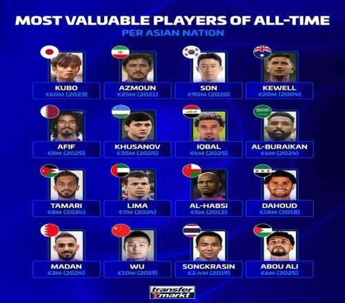 德转列亚洲各国地区历史身价最高球员:孙兴慜第1,武磊上榜